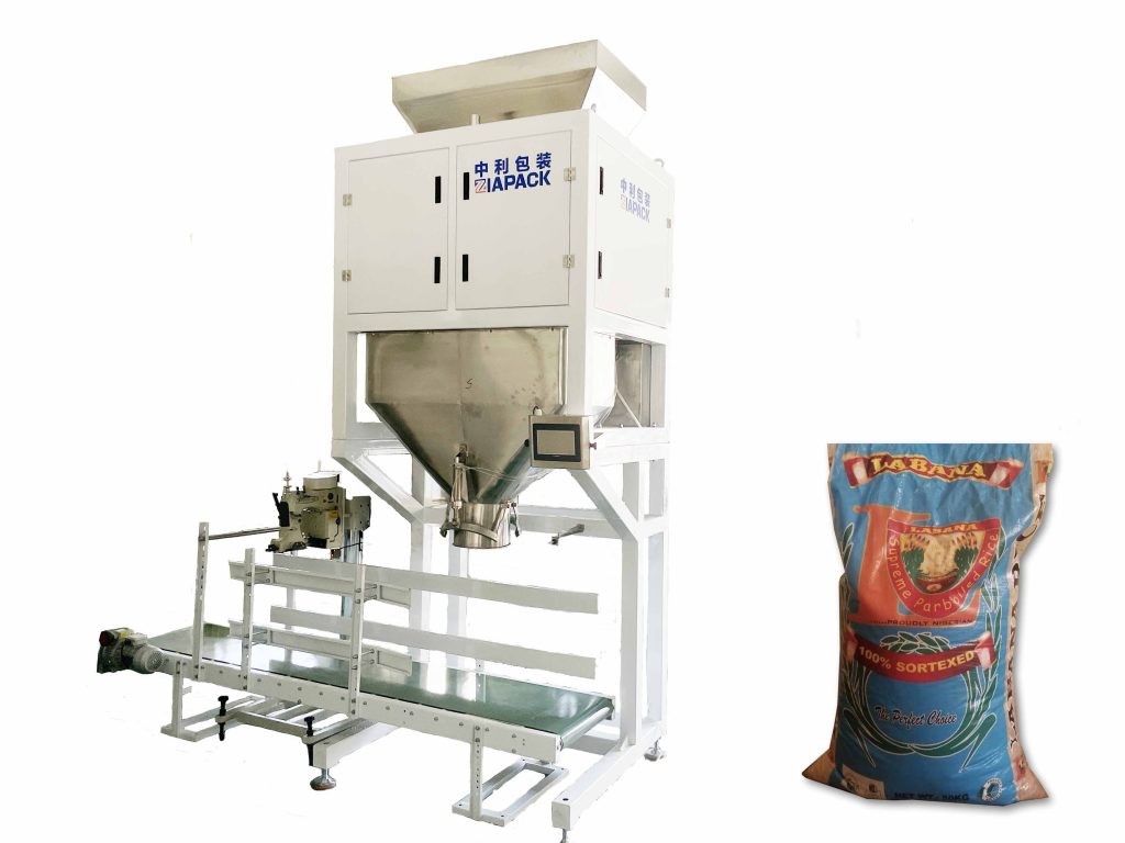 Aquesta unitat de màquina inclou una pesadora de galledes dobles per mesurar 30-50 kg. Una cinta transportadora de sortida de 3 metres, una màquina de segellat de bosses de PE i una màquina de cosir bosses de jute. Tota la màquina pot acabar automàticament el pesatge del producte, l'ompliment del producte, automàtic costura de la bossa i segellat tèrmic. Només cal alimentar manualment la bossa.