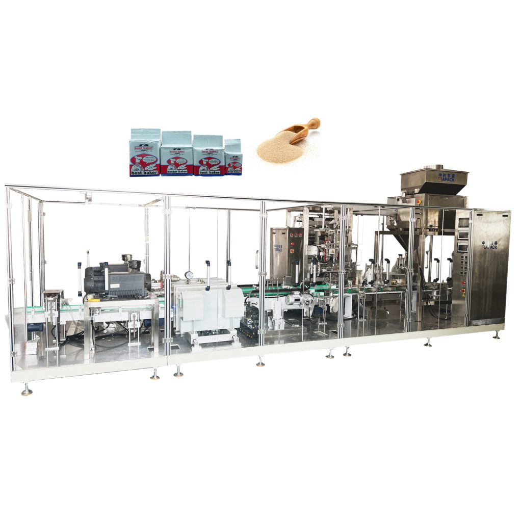Aquesta màquina inclou un elevador de buit ZK3 per alimentar el llevat sec, un conjunt ZL520 màquina d'embalatge i segellat de bosses verticals. Un conjunt ZLC4-2000 màquina de pesatge de quatre galledes, un conjunt ZL-100V2 màquina d'embalatge de doble cambra de buit. Aquesta màquina s'utilitza àmpliament per envasar productes químics de farmàcia d'aliments i altres productes en pols o grànuls petits. Com el cafè en pols, la farina de blat en pols de llevat i així successivament. Tota la màquina adopta dins el bombeig per aspirar el producte. El grau de buit és molt alt i la velocitat d'embalatge és molt alta, pot arribar a 30 bosses/min. El producte acabat té una llarga vida útil i una forma bonica.