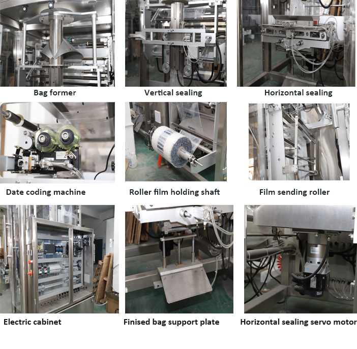 Aquesta unitat de màquina inclou un conjunt de màquines de segellat de farciment de bosses verticals ZL720 i una màquina de pesatge de quatre galledes ZLC-5000, un elevador vertical DT3 i una màquina transportadora de sortida. Segellat i codificació de la data. S'utilitza àmpliament per a l'embalatge de llistons, detergents en pols, arròs, fesols i altres productes granulars.